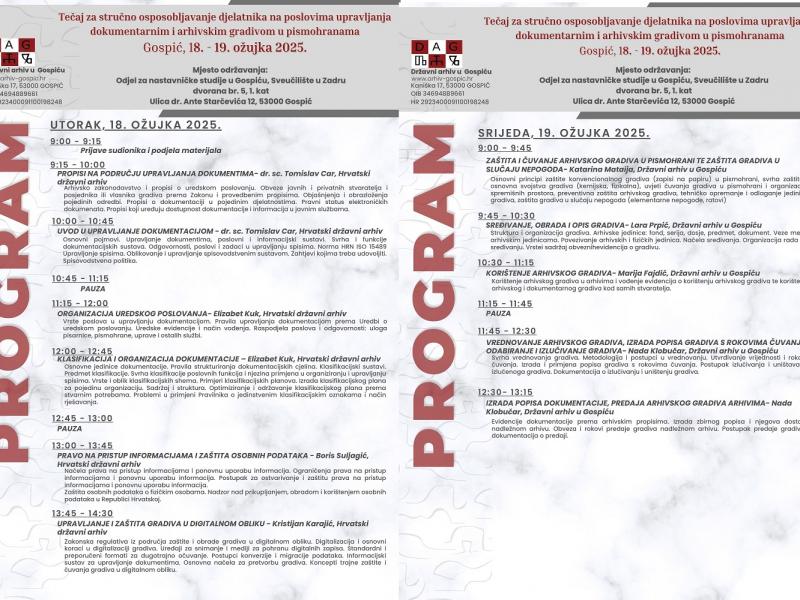 Državni arhiv u Gospiću održat će 18. i 19. ožujka 2025. godine tečaj za djelatnike u pismohranama koji su obavezni položiti stručni ispit sukladno čl. 46. Pravilnika o stručnim arhivskim zvanjima i drugim zvanjima u arhivskoj struci te uvjetima i načinu njihova stjecanja (NN 104/2019).